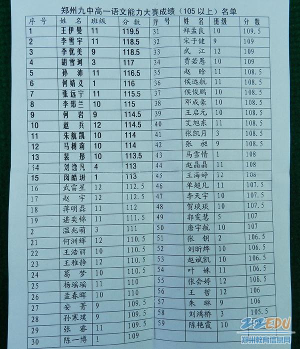 语文能力大赛入围学生名单及成绩公示表(105以上)